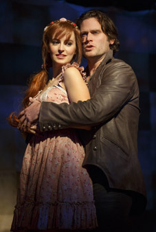 The gregarious Musgrove invites Jamie to meet his second wife Salome (Leslie Kritzer- imagine Carol Burnett on steroids playing a nymphomaniac, wicked stepmother) and beautiful, supposedly docile daughter Rosamund (Ahna O’Reilly with a pithier-than ingénue voice and spunky presence). Every boastful reference to wealth is greeted with more than usual interest. Jamie, it seems, his face masked in berry juice, moonlights as The Bandit of the Woods.