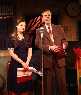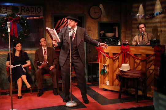 NOW it feels like the holiday season. Escape today’s uber-fraught world for 70 glorious minutes at Irish Repertory’s intimate W. Scott McLucas Studio Theatre. Attend a live 1946 broadcast based on Frank Capra’s iconic film It’s a Wonderful Life. Watch actors dressed in pitch perfect period street clothes (by Barbara Bell) gather at station W I R T, The Hearin’ O’ The Green, (mostly unused) scripts in hand, each morphing into multiple characters with speed, specificity, and charm.