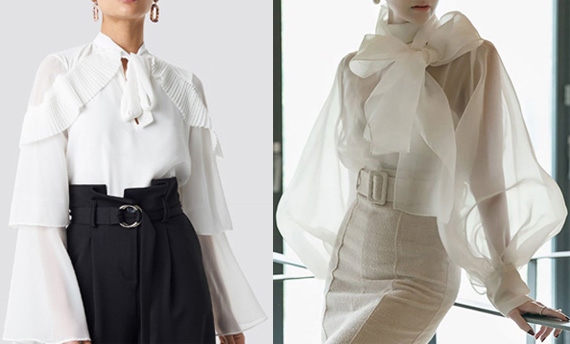 Left: Tiered Sleeve Blouse by NA-KD Party – Formalize office wear or dress up for evening. Self tie neck with a keyhole cutout, layered and wide long sleeves. Pleat details at the shoulders and sleeves. $33.95