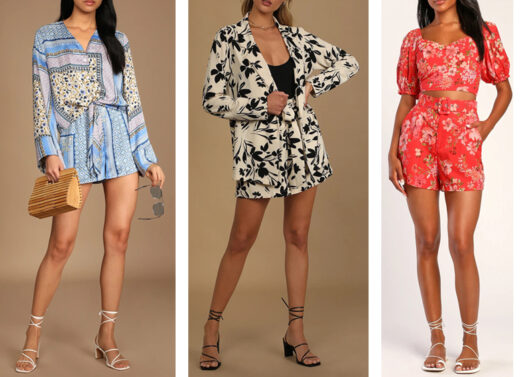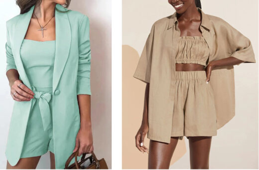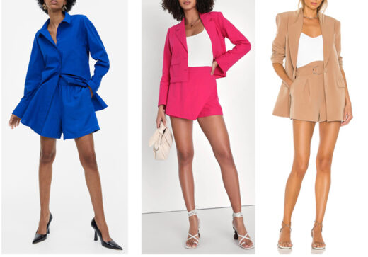 Left: Wide-cut One Button Blazer with Bow Knot Tie Up Waist Shorts and Camisole– three-piece set: Polyester. 12 colors $72.95