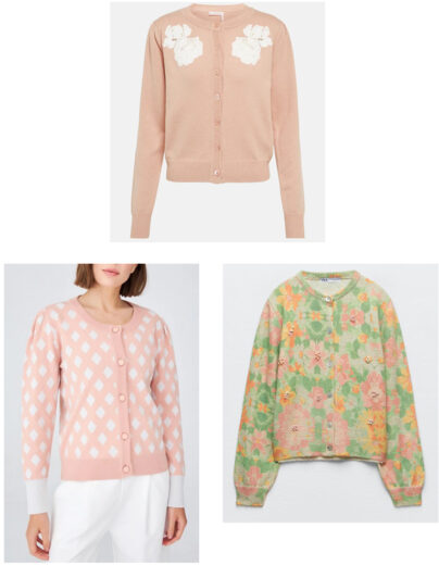 Bottom front and back: Vera Floral Corsage Cardigan: Bouquet of colorful flowers is embroidered into the back . Organic cotton, 3/4-length sleeves, hits at the waist. $139.00