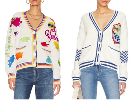 Left: Paint Splatter Cardigan by No! Jeans: 55% ramie, 45% cotton Lining: 95% cotton, 5% spandex Front button closure Front slip pockets Ribbed knit fabric “No” pin included $350.00