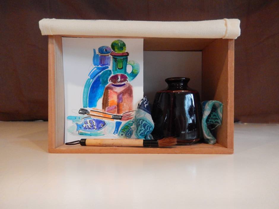 Marsha Solomon was one of many artists who answered this year’s open call at the Islip Art Museum to ‘think inside the box’ by creating works in an enclosure of some form that engages only one viewer at a time. “For a painter used to making wall-sized abstractions, this proved quite a challenge,” said Marsha Solomon, whose work can be seen in the opening photo. “I thought that pairing a poem was key, since it would correspond to this intimate, one-on-one experience of looking. I wrote the poem on a small curtain that covers the front of the box.  Then when the viewer lifts the curtain, they see a small still life painting (as written about in the poem) as well as the arrangement of the actual objects I used to create the composition.”