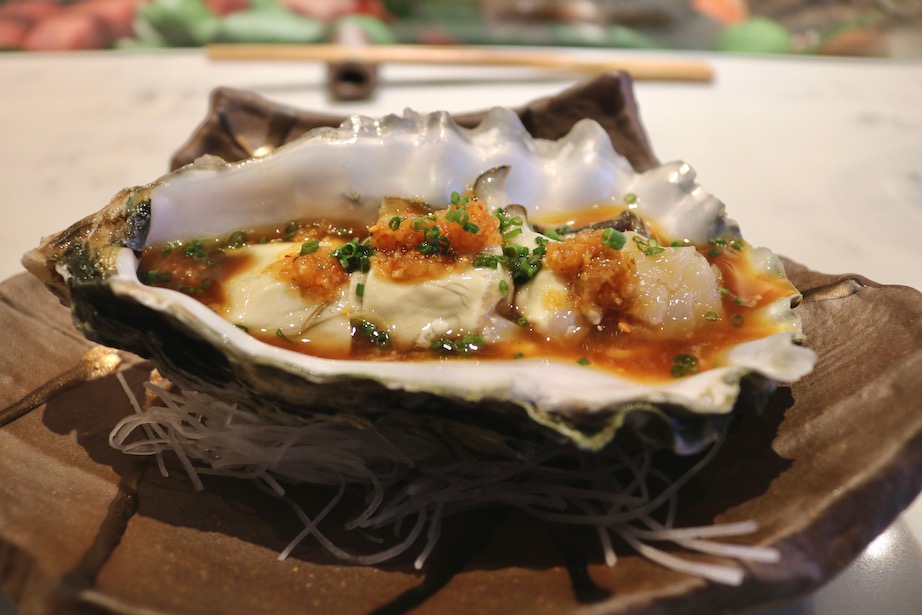 The 13-course tasting menu began with a hot brothy soup served in a ceramic tea kettle. The server instructed us to squeeze fresh lime into the soup, cover it, and allow it to seep for at least 30 seconds before pouring it into a small bowl. It was light and delicious, consisting of daikon radishes, shiitake mushrooms, and chicken for an overall earthy palate with a citric zest. The Pacific Coast Oyster (opening photo) was a standout dish—I couldn’t believe how gigantic the oyster was. It had a deep shell, and tasted very clean with a light sweetness, accompanied with a little spice from chiles and pazu sauce.
