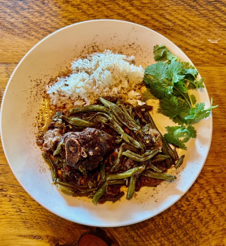 After three hours on the stove, the ebony-colored shanks will be tender, juicy, and falling off the bone; the green beans a combination of some mere wisps, others very soft but intact.