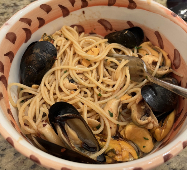 One pound of mussels will yield about four ounces of meat. A two pound mesh bag will feed two or four if served over pasta. Usually, when I cook for four, I’ll buy two bags and look forward to a few leftovers the following day. Below are three recipes to suit your mood, your guests, and the ingredients you may already have on hand.