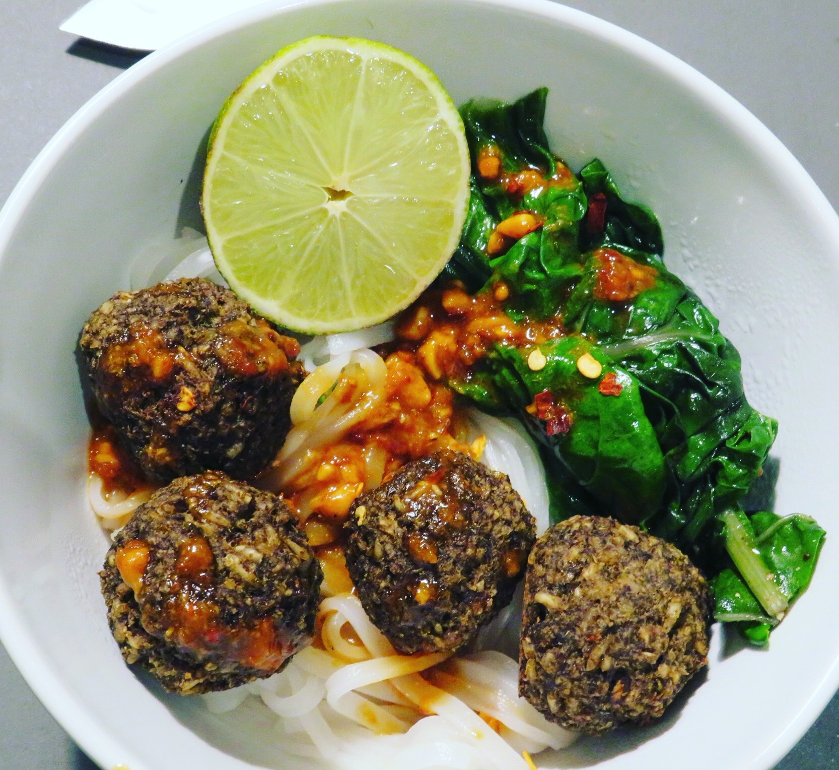 - When meatballs are cooked, pour sauce over meatballs and serve over rice noodles with sautéed greens.