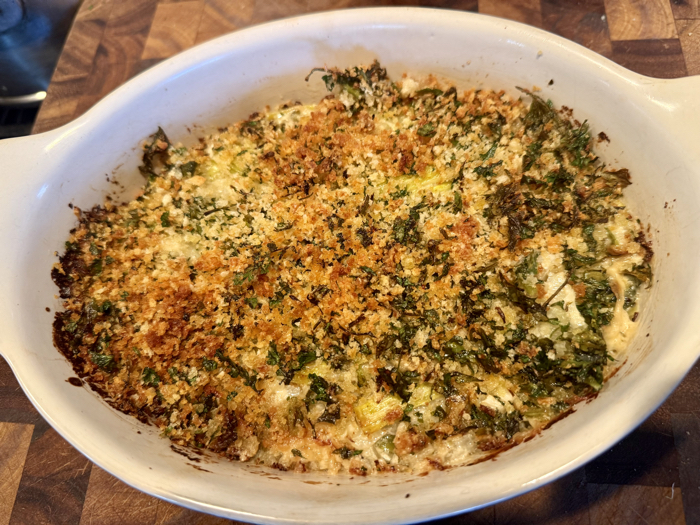 Preheat oven to 400°.  Place the sliced fennel and leek in a large pan. Cover with cream, add salt and pepper and cook over low-medium heat until somewhat soft. (Stir frequently to prevent burning.)  Transfer the mixture to an oven-proof casserole and top with a mix of the breadcrumbs or panko, olive oil, parsley and Parmesan cheese. Bake for about 30 minutes until topping is golden and crunchy.
