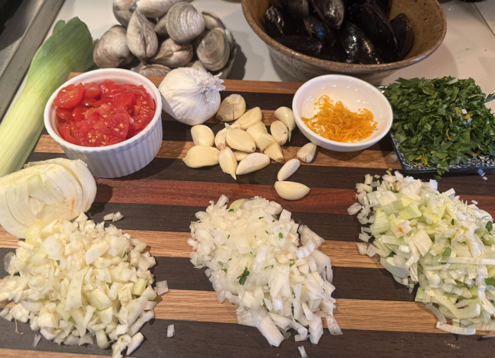 1. In a large pot, sweat (over a low flame) the onions, fennel, and leek in the olive oil about 5 minutes or more. When the vegetables are soft, add the garlic and continue to sweat until they’re soft, too.
