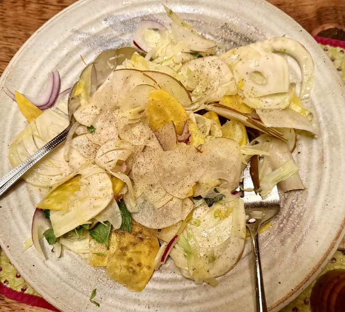 Raw fennel adds happiness and crunch to many salads—complementing deep greens, citrus, goat cheese, cranberries, shallots and nuts. Recently I’ve been making a shaved fennel, pear, and beet salad using my new favorite kitchen tool, a Benriner mandoline (above, from Amazon).