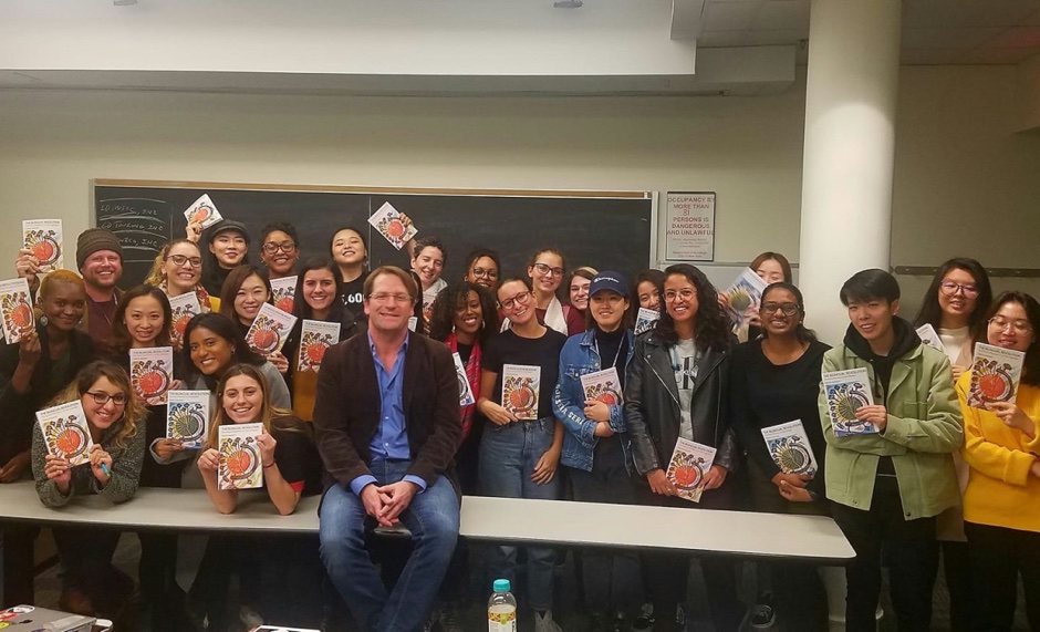 Top photo: Fabrice Jaumont with students and his book “The Bilingual Revolution” at New York University, photo by Meichen Jin