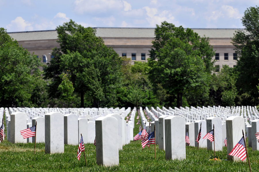Top photo: Gravestones decorated with U.S. flags to commemorate Memorial Day at the Arlington National Cemetery in Arlington, Virginia, near Washington DC, with Pentagon in the background.
