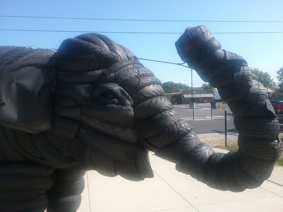 Top: “Car tire art” sculpure in the backyard of the Sanctuary’s visitor center