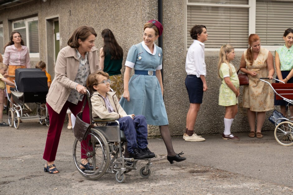 Another plot line in the eighth season focused on a measles epidemic and a vaccination trial that was being resisted by many skeptical parents. Fast forward to Call the Midwife’s fourteenth season set in 1970. The measles vaccine is now available, but still meeting with objections from some parents. Something happens that turns the situation around. A single mother, Jill Trottwood (played by Joanna Horton), becomes a passionate promoter for the vaccine. Jill’s son, Andrew, became ill with measles and suffered a brain infection that has left him disabled. Jill positions herself outside a school, Andrew in a wheelchair, and when parents and their children leave, she hands out flyers about the vaccine. She tells parents that Andrew had measles before the vaccine was available and urges them to protect their children. Soon, a long line forms outside the clinic.