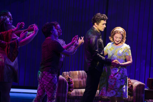 We go back to the “beginning.” Having been gifted a guitar at 15, Diamond none the less goes on to pre-med while continuing to plug his songs. He thinks of himself as a writer, not a performer. At last, the extremely insecure Flatbush boy meets someone in the Brill Building (pop song central) who agrees to listen. Singer, songwriter, producer Ellie Greenwich (Brie Sudia with just the right balance of toughness and sensitivity) briefly listens pouncing on the third song, “I’m a Believer” which becomes Popular Song of the Year 1966 (for The Monkees) and goes gold. Cue BIG production number. Wife Jaye (a solid Jessie Fisher) is thrilled. Her husband not so much.