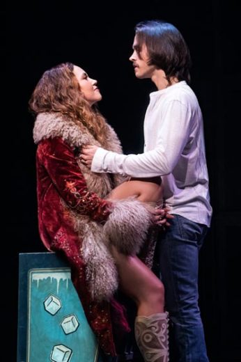 De Barres thinks Crowe’s take is a “horribly misogynistic look at what a groupie-muse is” and that he whitewashed the scene. The former is a matter of perspective. The latter, at least in a musical, has understandably been cleaned up. One does wonder at the off-handedness with which Russell Hammond’s (Chris Wood – good actor, bad miming guitar player) acid-infused leap off a roof is depicted, however. He miraculously comes away with barely a scratch, but oh, the engineered flight down is grand.