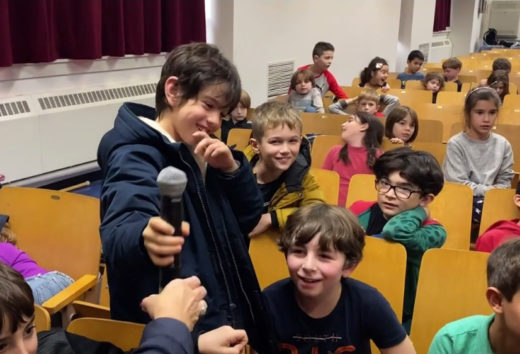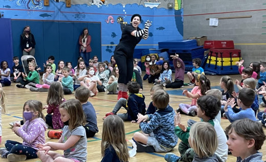 Lastly, the children are encouraged to ask questions. (Miller circulates with a microphone.) Gasta is asked how she plays so many characters. “You’re silly!” The thespian indicates a way kids can make butterflies with their fingers and hands. Drinking from an invisible cup, she points out the need to “give objects not there, their own space.” Two hundred little hands follow suit. The mime talks about telling a whole story “all by yourself. You don’t need costumes or props.” “Do you talk at home?” she’s asked. “Do you wear that every day?”(A reference to classic mime apparel.)