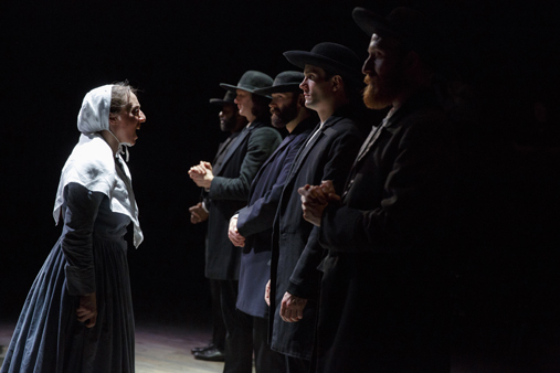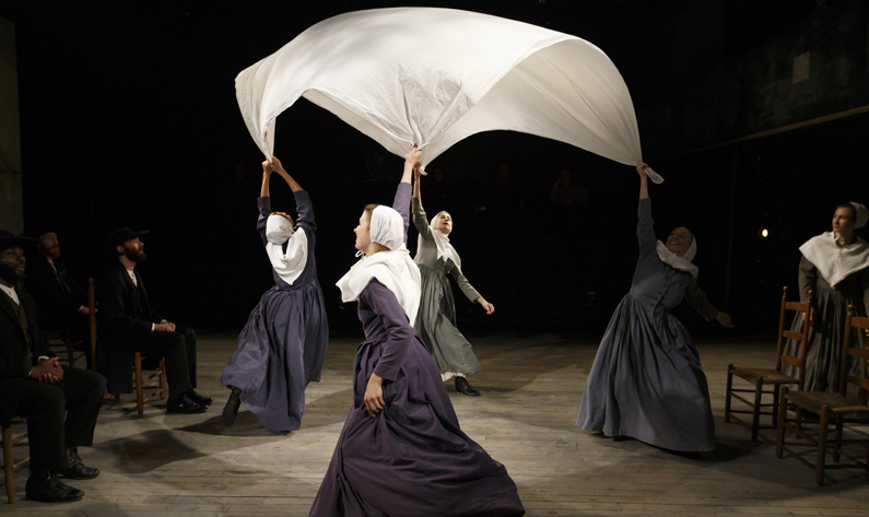 A stark room holds only scattered chairs. Wisely, there’s no raised stage, just the wood floor between two sides of gradated seats and a balcony. At the back, we see a white wall and windows indicating time of day. At the front, a sliding door closes us in. (Marsha Ginsberg-Set) Shakers enter, sit, and meditate, registering no one else’s presence until all are accounted for. (Traditional costumes are skillfully imagined by Donna Zakowska so that they can gracefully move.) ‘Tis the gift to be simple, ’tis the gift to be free/’Tis the gift to come down where we ought to be… they sing (a traditional Shaker dancing song by Joseph Brackett).