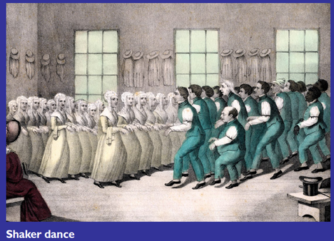In the 18th century, when Quakers began to give up wildly abandoned spiritual expression, a splinter group was formed. The United Society of Believers in Christ’s Second Appearing (USBCSA), or the Shakers, then also known as the “Shaking Quakers,” held fast to the practice of physically frenetic, emotionally expressive sessions during which they often testified and ostensibly received messages from God.