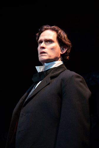 John Wilkes Booth (Steven Pasquale), run to ground with a broken leg and hiding in a barn, is determined to get his “indictment” on paper before facing surrounding law enforcement. (There’s no indication of location or the wound.) “What I did was to kill a man who killed my country,” he self-righteously sings, secure in the greater goal of ridding us of President Abraham Lincoln. Pasquale ably fills the role evolving into a malevolent influence. When the balladeer refers to him, Doyle has Booth tell him to “shut up” – somewhat mitigating the effect of sharp lyrics.