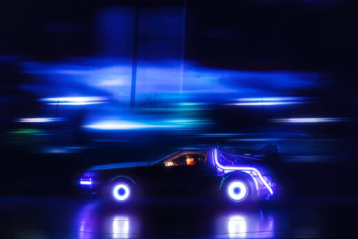 The car, which answers only to Doc Brown, is powered by stolen plutonium, a major plot point in the film. (One line as to how that was managed would add.) Marty tapes his friend for posterity, but an accident injures the scientist. Without thinking the boy jumps in the car to alert a hospital. Already set to November 5, 1955, the day Doc conceived of time travel, the machine takes off in a whoosh! We see blurred landscape pass as the car turns. Effects are terrific. The vehicle crashes into a hay barn and can’t be started again due to the voice recognition feature and, whoops, lack of plutonium. Marty wanders into 1955 Twin Pines.