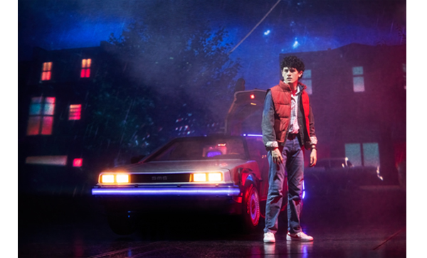Colorful lighting circuitry covers the balconies and ceiling. On screen, a digital clock clicks backwards to 1986. Teenage Marty McFly (Casey Likes) visits the workshop of eccentric scientist friend Emmett “Doc” Brown (Roger Bart). Tim Hatley’s set design is just right, a chaotic amalgam of found, repurposed objects and bizarre constructions. Marty finds a note asking him to show up at the Twin Pines Mall parking lot at 1:15 a.m. The boy plugs an electric guitar into a giant speaker and blows a fuse. This awkwardly introduces us to the fact that he’s in a rock `n roll band. Girlfriend Jennifer (Mikaela Secada) encourages him. The first two numbers are generic.