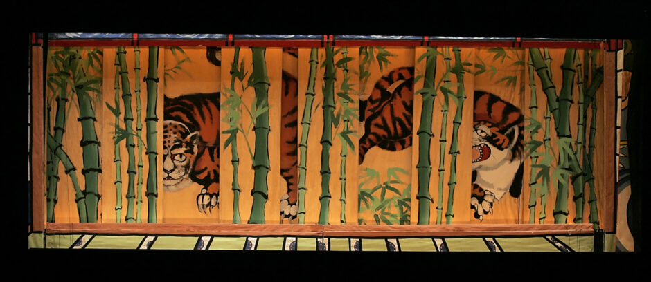 Twist was at a puppet festival in France when he saw a display of Japanese puppets from the island of Awaji where Dogugaeshi originated. (There were once 80 companies in situ.) Next to the exhibit a video ran. After what appeared to be Bunraku, a succession of elaborate, overlapping screens slid across one after the other. These, he tells me indicate a palace. “I was absolutely captivated.” Twist had experienced the art of Dogugaeshi: dogu= set; gaeshi= flipping.
