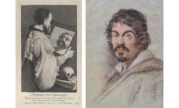 Opening images: Left: Portrait of Caravaggio, turned to the right and looking at his reflection in a mirror by Henri Simon Thomasson (1687-17-41) CC0 1.0 Universal Public Domain Dedication.