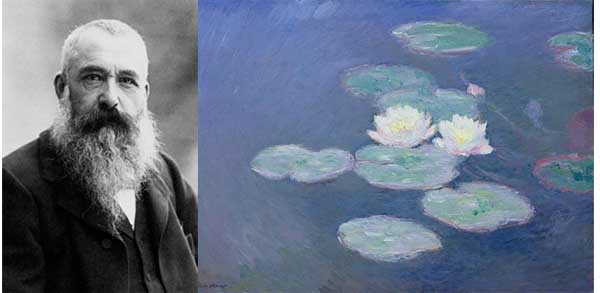 Opening: Left- Claude Monet by Nadar 1899 (Public Domain; Right- Claude Monet- Nymphéas effet du soir Musée Marmottan (Public Domain)