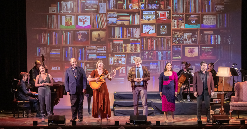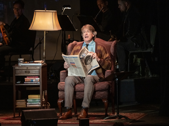 Sitting stage left in a high backed arm chair, Dick Scanlan muses on/narrates this presentation as if Alastair Cooke for Masterpiece Theater – well, not so rarified. The artist’s lifelong love of and involvement with theater is reflected in illuminating, opinionated, droll exposition written by him with Malcolm Gets. Lightness of spirit pervades. Ostensibly catching up on old copies of the New Yorker and Village Voice, Scanlan objects to some early pigeon-holing of the lyricist.