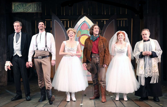 We find ourselves in the late 1800s out West: cue horse neighs, wagon wheels, a fiddle in the band. A noose drops from the ceiling. Poor Johnny Blood (Conor Ryan) has drunkenly killed a man who was molesting his girl, saloon singer/prostitute Bella Rose (Lauren Molina). That it was self defense is irrelevant to Governor Von Richterhenkenpflichtgetruber (Nick Wyman as Shakespeare’s Angelo), aka “the hanging Hun,” who feels every crime is punishable, if only to keep the slate clean. We’re treated to a gleefully villainous comic turn the likes of which has not been seen in song since Captain Hook. Sweet, dense Johnny, cooling his heels in The End of the Trail Jail, will hang.