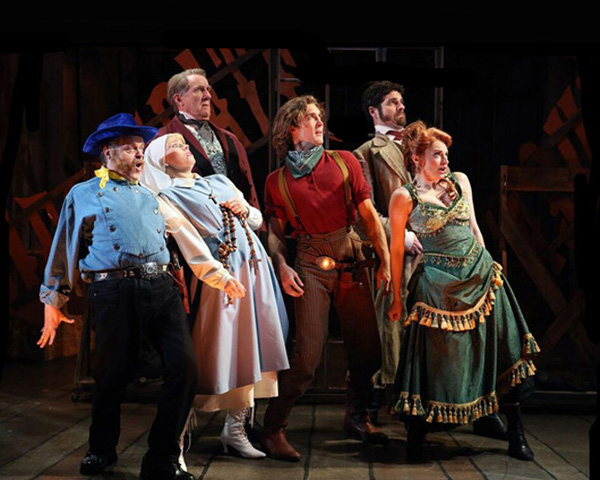 We find ourselves in the late 1800s out West: cue horse neighs, wagon wheels, a fiddle in the band. A noose drops from the ceiling. Poor Johnny Blood (Conor Ryan) has drunkenly killed a man who was molesting his girl, saloon singer/prostitute Bella Rose (Lauren Molina). That it was self defense is irrelevant to Governor Von Richterhenkenpflichtgetruber (Nick Wyman as Shakespeare’s Angelo), aka “the hanging Hun,” who feels every crime is punishable, if only to keep the slate clean. We’re treated to a gleefully villainous comic turn the likes of which has not been seen in song since Captain Hook. Sweet, dense Johnny, cooling his heels in The End of the Trail Jail, will hang.