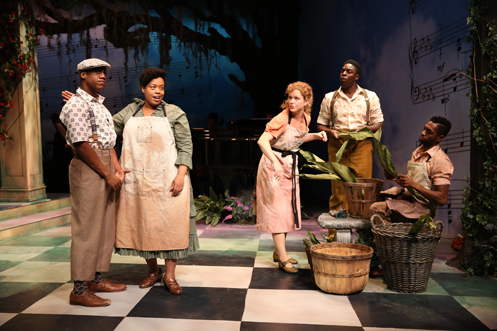 This is not so say Rainbow Valley, Missatucky (Mississippi and Kentucky) is not an entertaining place to visit. (Whimsy later includes the Shears-Robust catalog.) James Morgan’s charming set, dripping with foliage, flowers, song scores, and storybook sentiment, creates an immediate aura of illuminated make-believe. By the time the small band, replete with lovely harp, begins its mini overture, we’ve settled in with pleasant expectation.