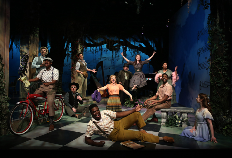 This is not so say Rainbow Valley, Missatucky (Mississippi and Kentucky) is not an entertaining place to visit. (Whimsy later includes the Shears-Robust catalog.) James Morgan’s charming set, dripping with foliage, flowers, song scores, and storybook sentiment, creates an immediate aura of illuminated make-believe. By the time the small band, replete with lovely harp, begins its mini overture, we’ve settled in with pleasant expectation.