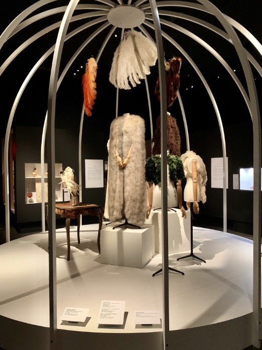 Fashioning Wonder offers a fascinating interpretation of the Wunderkammer concept. There are almost 200 garments and accessories that have been put into ten key themes that include Artisanship, Specimens, Anatomical Theatre, and others. One of these themes, the Aviary has a large birdcage in the center of the museum’s space with ornate garments trimmed in feathers. In modern fashion design, items trimmed with feathers are less popular due to the public’s environmental concerns.