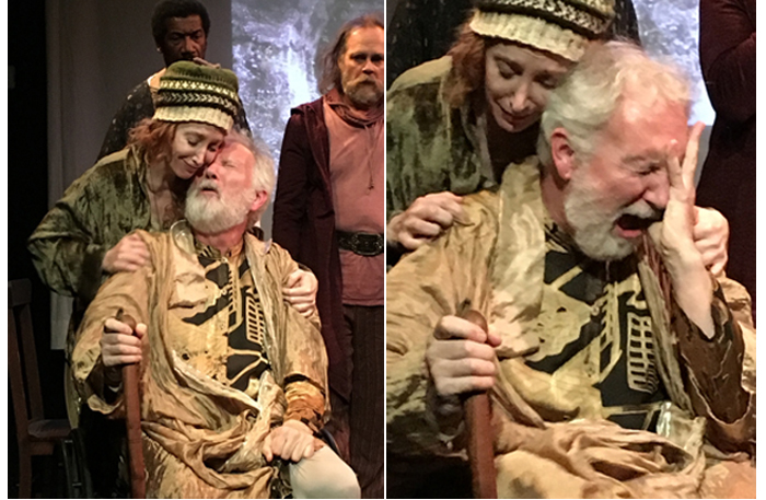 Kee gives both Lear and his Fool wonderful small moments, many noting esteem and affection. Hats and shawls become sentiment. Tom’s madness takes possession of him like theatrical epilepsy. Silently, the Fool ends this version in a turn reminiscent of Puck’s final speech in A Midsummer Night’s Dream. v It’s splendid. Overall pacing and individual timing are adept even when an actor is less secure with language. Use of the small stage is expressive and fluid.
