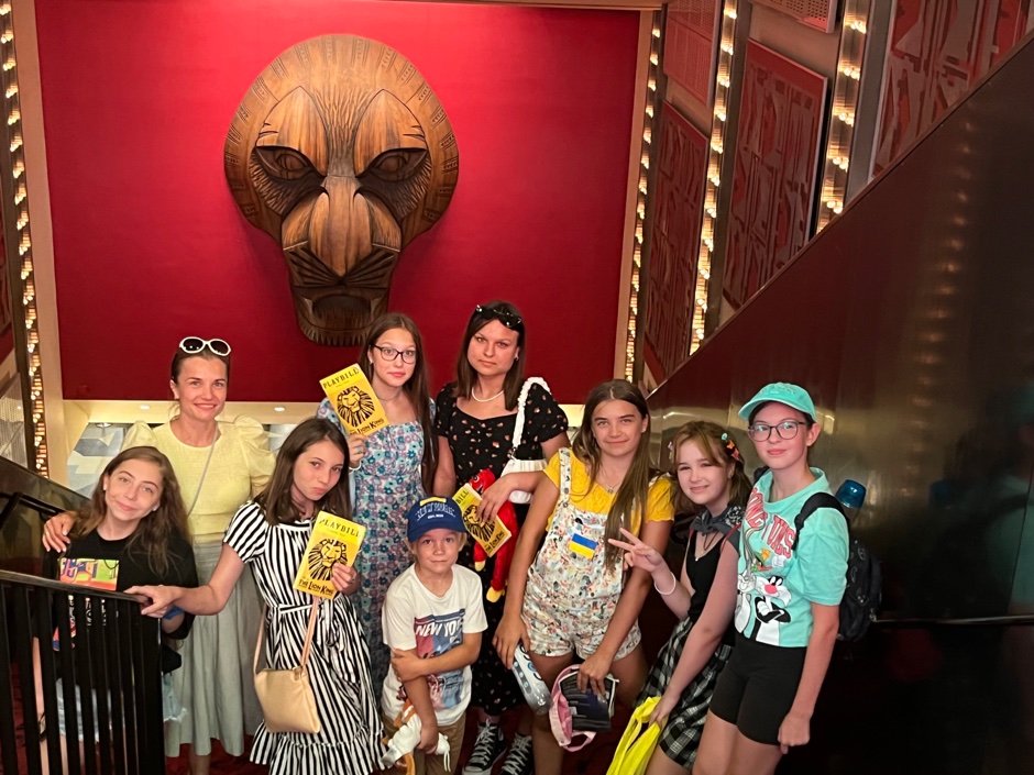 Top photo: The Lion King on Broadway, l. to r.: Anastasiia Mysiuha, Mariia Oneshchak, Valeriia Khozhempa, Nikol Bodiuk, Oleksii Oneshchak, Khrystyna Hniedko, Hanna Oneshchak, Marharyta Kuzma, Sofiia Goy