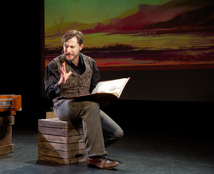 Songs have an early American, frontier feel, both hoedown and ballad. Even with only two (skilled, multifaceted) musicians, it’s easy to imagine full scoring. Unfussy lyrics illuminate character and carry the story without falling into the trap of utilizing rhyme for rhyme’s sake. Melodies may not be memorable, but are engaging. Vocal arrangement is adept. Economic dialogue embraces sincerity with more than common musical theater nuance. A comic number in which a bearded Nick Sullivan plays Queen Victoria singing about sex is amusing- not the least because of the excellent actor- if a bit extraneous.