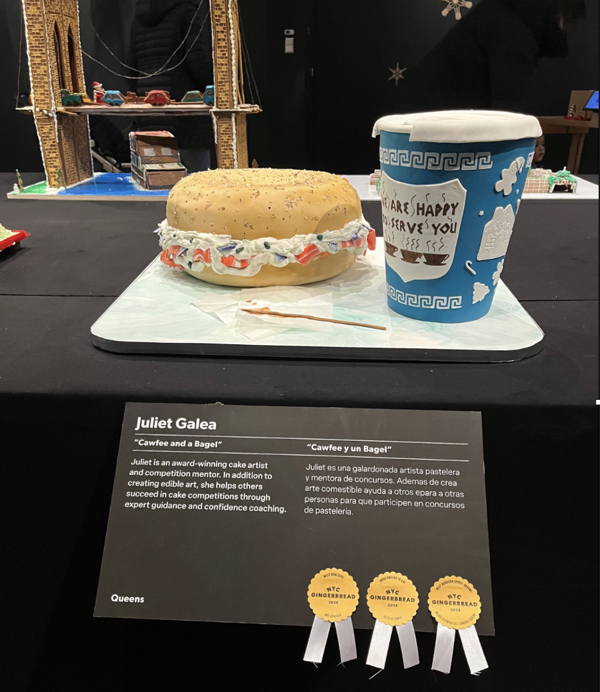 Another entry that won recognition includes two items that are ubiquitous in New York – the bagel and the takeout coffee cup that says, “We are happy to serve you.”
