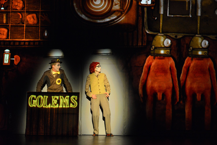 Actors’ eyes are outlined in black, faces are almost white, wigs splendidly exaggerated. Sarah Monroe’s Costumes are wonderfully inventive. Paul Barrett’s illustrated scenery is appealing, a kind of dark, decorative children’s book filled with social commentary. Interaction between live actors, actors on screen, claymation and ‘drawn’ animation is skillfully and humorously coordinated offering endless surprise. Overall aesthetic combines silent films (sometimes these flicker), especially those from Eastern Europe, with Bauhaus, and Dadaist images. Our protagonist resembles Woody Allen in Sleeper.