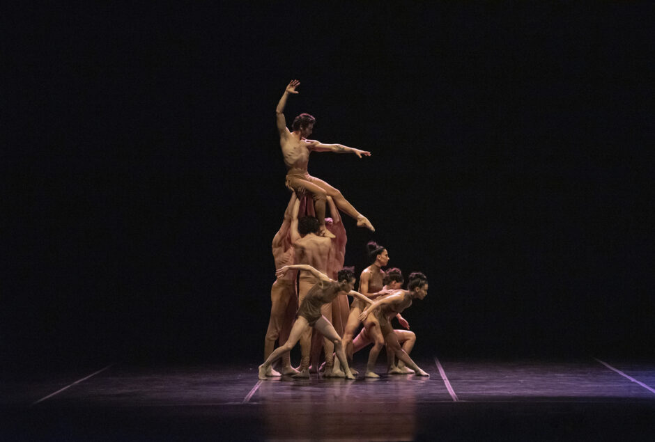 “Amid the chaos, Guyra injures a white man, an act that inadvertently takes the life of his beloved. In a poignant moment of transformation, he metamorphoses into an Urutau bird, soaring towards celestial eternity.” A solo by Cornejo. Desolation viscerally wrenches through the warrior body. Dancing is vigorous, control masterful, mien magisterial.