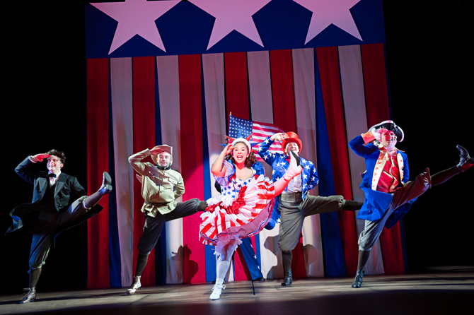 Chaos of the troop when hiding from an angry landlord is handled with Hellzapoppin’ creativity and timing, but continues too long, quashing the lyric humor of “Have An Eggroll, Mr. Goldstone.” (Andrew Kober’s confusion is just right.) Two-handers are adroitly directed. Scenes transition well. The stage is ably used.