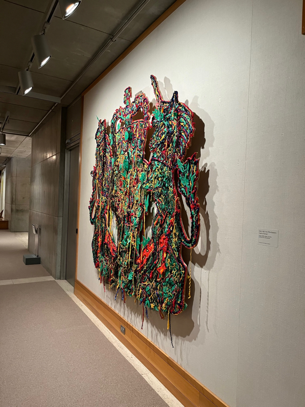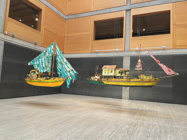 The exhibition is on the second floor, but one of Locke’s most impressive productions is on display in the museum’s expansive lobby. “Boats” consists of three vessels -“The Survivor,” “Desire,” and “The Relic.” All are made from wood and mixed media, with “Desire” adding metal and fabric. Inspired by his own journeys between Britain and Guyana, one can imagine that these trips were often difficult, even dangerous. The exhibition’s notes comment: “Like ghost ships, they are devoid of people, but their cargo alludes to disparate travelers, ranging from tourists and traders to refugees and pirates.”