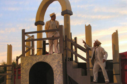 Plays are predominantly staged to look like the period in which they’re set, not as Elizabethan. “We tend to evoke a ‘feeling’ of historical authenticity rather than being true to any particular time. This is very important when working with two shows that share a set,” Dutiel notes. That being said, Merchant of Venice and A Midsummer Night’s Dream have both appeared to be Regency- without changing script. Today, the company uses a basic structured set adding a skin or façade. There’s a balcony level with stairs up to scaffolding and two 10 x 10 tents for costume change and make-up application.