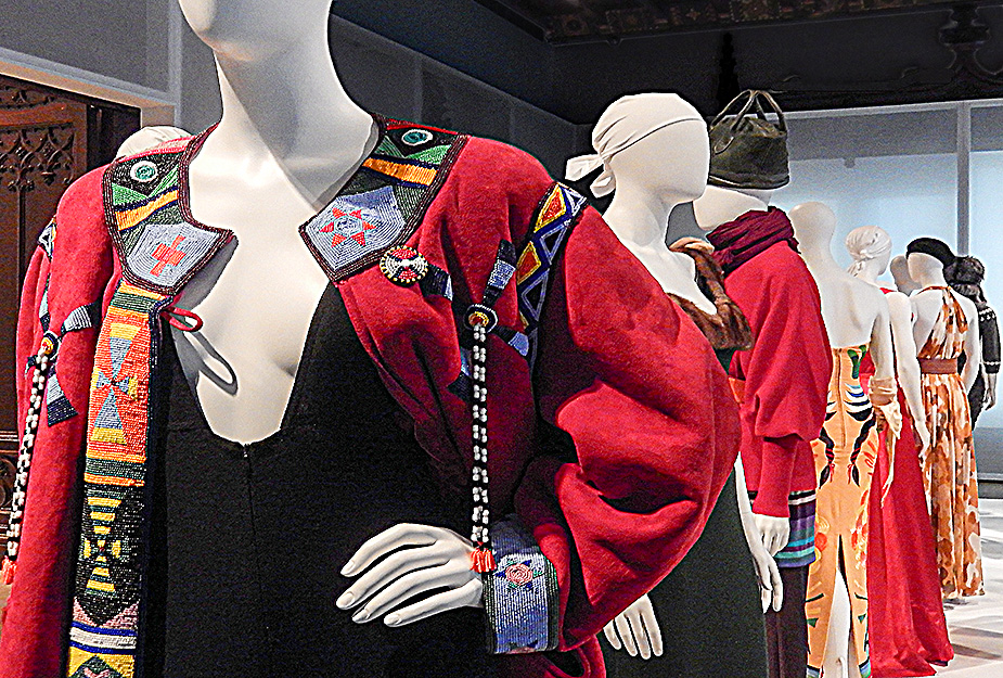 It’s unusual to think of fashion having a tie into conceptual art, but some of Mizrahi’s more complex and challenging works do. “The Real Thing,” a shimmering mini-dress, is stunning in red and white. Then we learn it’s made from punched circles of aluminum taken from Coke cans. Mizrahi worked with the charity We Can, which employed the homeless to collect cans for recycling. Snippets of aluminum were sent to France where they were turned into paillettes, or dangling sequins that were then sewn onto the garment by seamstresses in India. It took a global village to produce, but the result is dramatic and chic. It forces one to stop and realize that the woman who purchased the dress was likely far removed socially and economically, but possibly not geographically, from the needy people who gathered the cans. There’s also a hint at corporate responsibility, and the idea that high and low don’t always mingle into lovely harmonies. Several of the pieces on display speak to political, religious, economic, racial and gender issues.