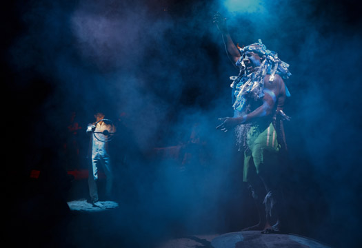 There’s a live chicken and a goat in stylish diapers. A stew being cooked briefly burns my eyes with vapor of onions (smells good.) The theater is festooned with salvaged garments and shoes on clotheslines. Boulders and tree branches extend out into the audience. Music emerges from atop a metal shipping container. The edge of the sea is real water as is rain. On stage fire appears in metal trashcans, atop torches, on candle chandeliers adroitly collaborating with Jules Fisher and Peggy Eisenhauer’s haunting Lighting Design. The performance space is a sand pit filled with beach debris – an overturned rowboat, plastic bags and bottles, dried palm fronds, a steering wheel, crumpled paper, buckets, crates, a fishing rod…(Dane Lafferty-Set Design)