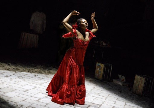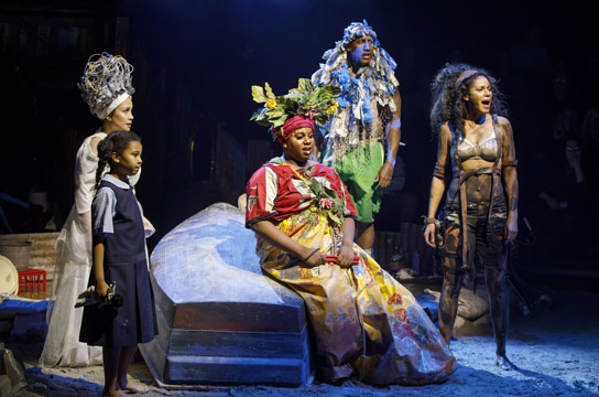 Brilliant staging by Michael Arden makes full use of the oval, sunken pit that gives the theater its name, often placing the gods among us. A tall metal gate to the landed gentry is evocative. Illuminating the island’s history of bad blood between classes with a shadow play catches imagination. The body of a car is quickly fabricated out of seaside garbage; Ti Moune morphs into a young woman before audience eyes. None of this is overblown or gratuitous.