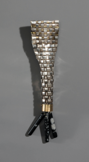 Brooch; Spirit With Three Legs 1988, from the “Spirit House” series, silver, 18k woven structure and agate, by Arline Fisch