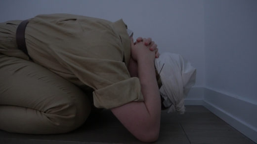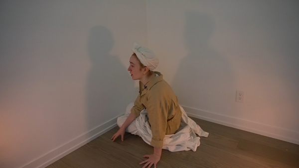 Joan is imprisoned in a small, white room with a wood floor. Dressed in boys’ clothing, cloth wrapping her hair, she has only a single sheet for comfort and warmth. We hear dialogue as she dreams of her family. Awake, the Maid of Lorraine converses with Saint Catherine (Monique Danielle), Archangel Michael (Simon Gagnon), and Saint Margaret (Lee Stone), who conveyed God’s instructions leading her on the path she followed.