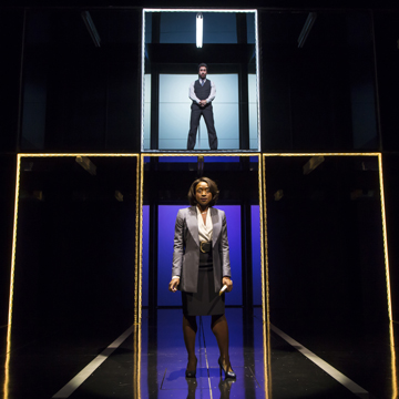 The glossy Set by John Lee Beatty in perfect symbiosis with Lighting Design by Ben Stanton imagines two tiers of cubicles which light up and disappear as if internal circuitry. Action between these locations is decisive and often purposely once-removed. An apt metaphor – jarring to the audience, but when working at full optimization, creating a highly functional semblance of normalcy. Furniture for contained scenarios, slides in and out with efficiency.